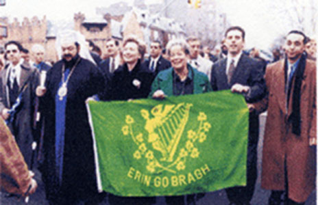 pride organizations, Mexican cultural societies, bag-pipers and even Mayor Jimmy Mulroy of the historic Irish city of Drogheda. Michael Bloomberg, the first New York City mayor to attend the parade, is seen in upper left photo with Senator Hillary Clinton and locals just before the start. In bottom left, Mychal McNichols (left) and Parade Chair Brendan Fay hold a banner honoring Fire Department Chaplain Mychal Judge, who died in the line of duty responding to the September 11 terrorist attacks. Greek Orthodox Bishop Pangratios, Senator Clinton, Borough President Helen Marshall and City Council Member Eric Gioia display an Erin Go Bragh banner in upper right photo. But the event’s shining stars were the mixed-grade students from P.S. 199 on 48th Avenue. Shown in bottom right, they held signs thanking rescue workers and sang school spirit songs as they followed the Skillman Avenue parade route. (photos: Odette Lupis)