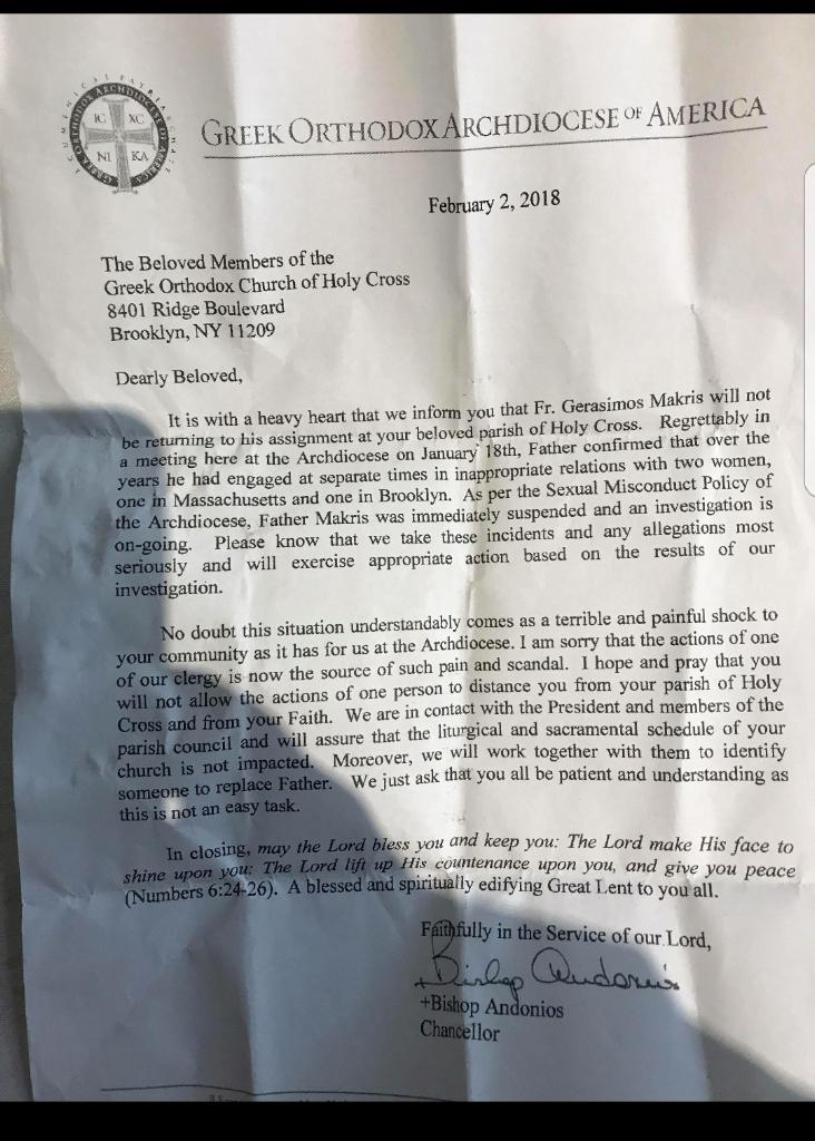Makris was accused of engaging in sexual misconduct with two adult women, one in Massachusetts and one in Brooklyn. According to a letter dated February 2, 2018, and addressed to the Holy Cross Community, Makris admitted to having “inappropriate relations” with both.